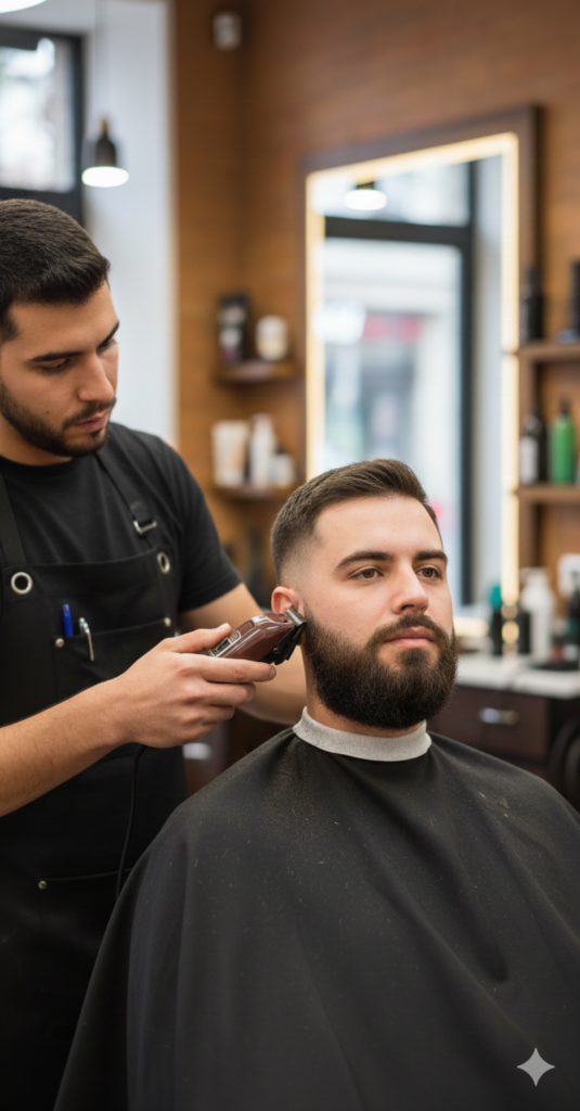 Aparagem completa da barba com máquina, ideal para quem gosta de um visual prático, uniforme e bem alinhado.